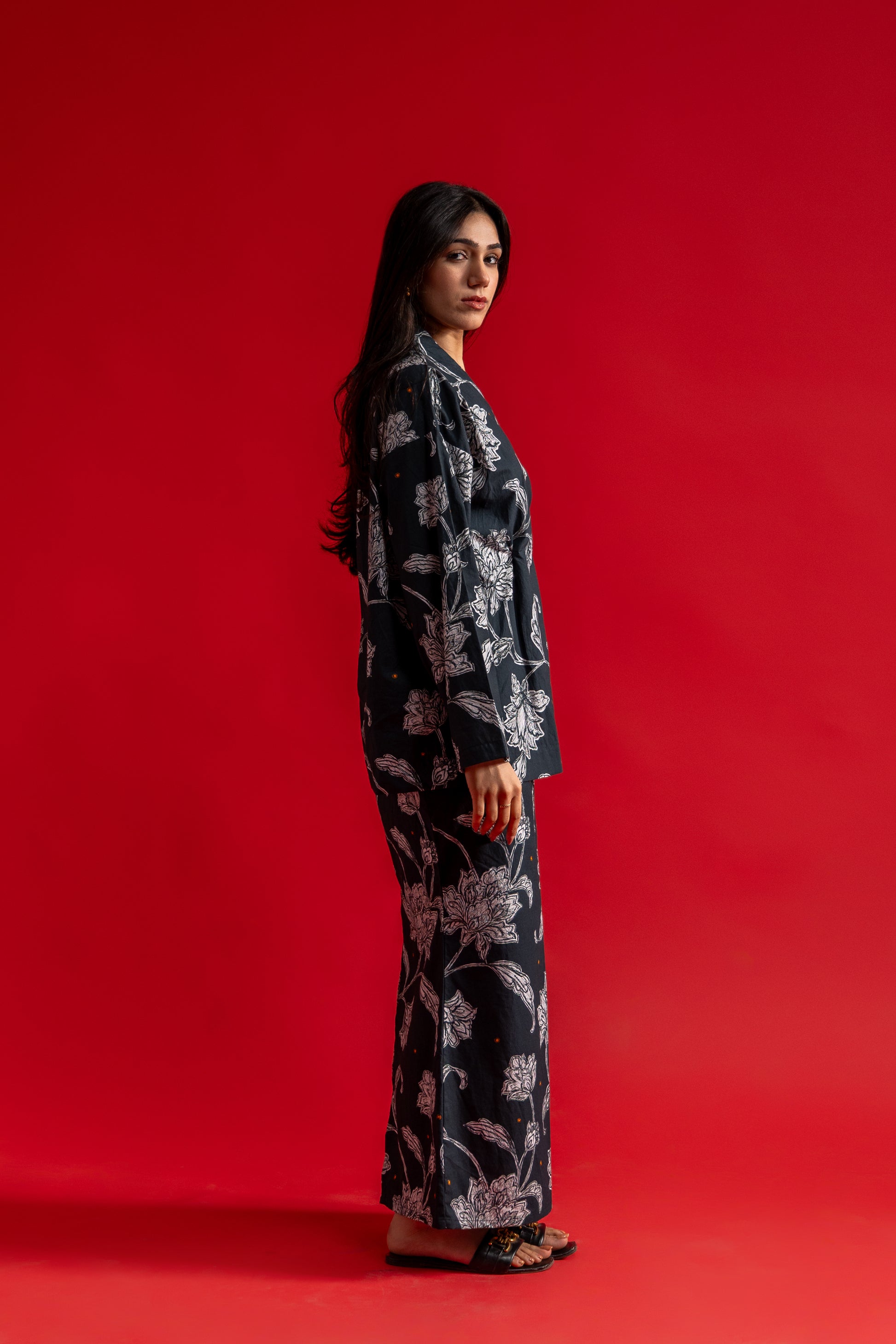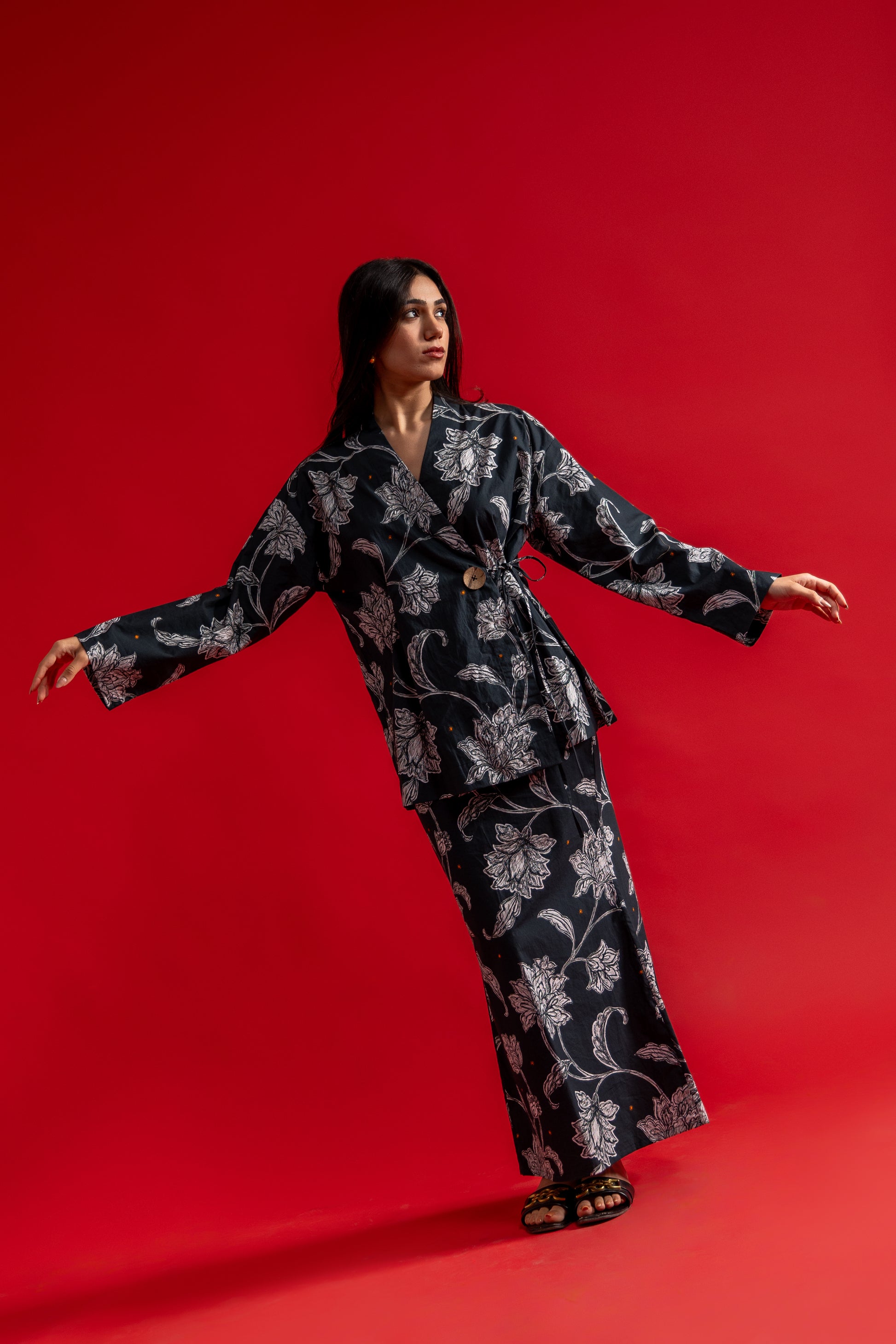 Crafted in breathable organic cotton, this fitted long skirt is designed to contour the body with a sleek silhouette, finished with a subtle back slit for ease of movement. Elegant and striking, it pairs effortlessly with the kimono top for a refined, statement look.